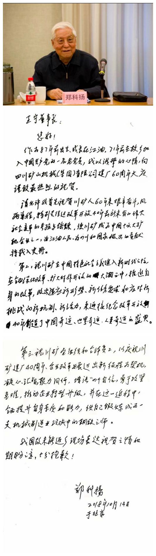 原中組部副秘書長、中央政策研究室副主任鄭科揚(yáng)專門為川礦集團(tuán)六十周年華誕發(fā)來的賀信
